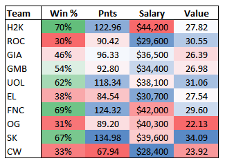 Alright, so now that we all know my favorite team for tomorrow, let's think about some of the other match-ups. Unsurprisingly my model likes the odds associated with H2K, UOL and FNC. For a tournament lineup, it could definitely make sense to run some stacks from the GIA / GMB game, as they'll likely be relatively low owned due to uncertainty around the outcome.